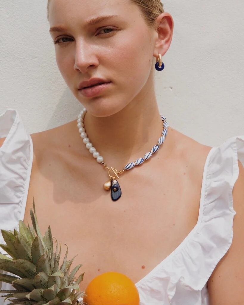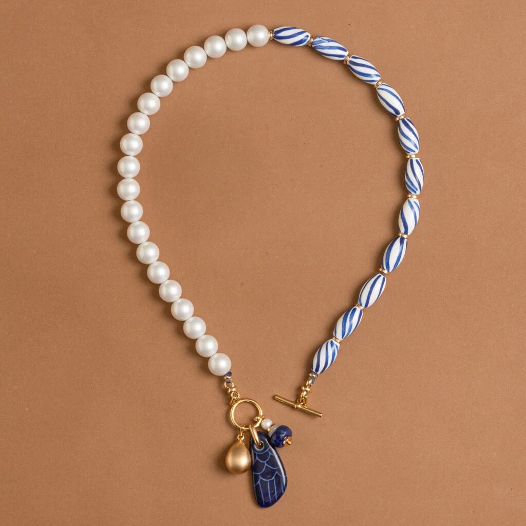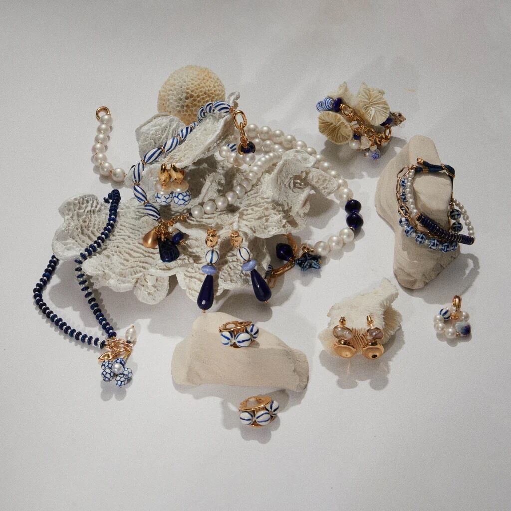 起源を明確に示すトーンを通して海の美しさとストーリーテリング提示するジュエリーのコレクション。真珠と青いビーズで飾られたネックレス、着用者が好きなように組み合わせることができます。