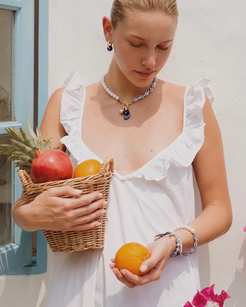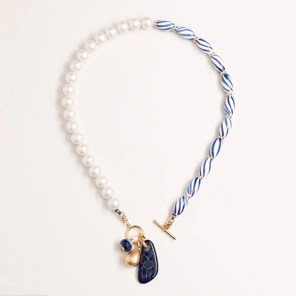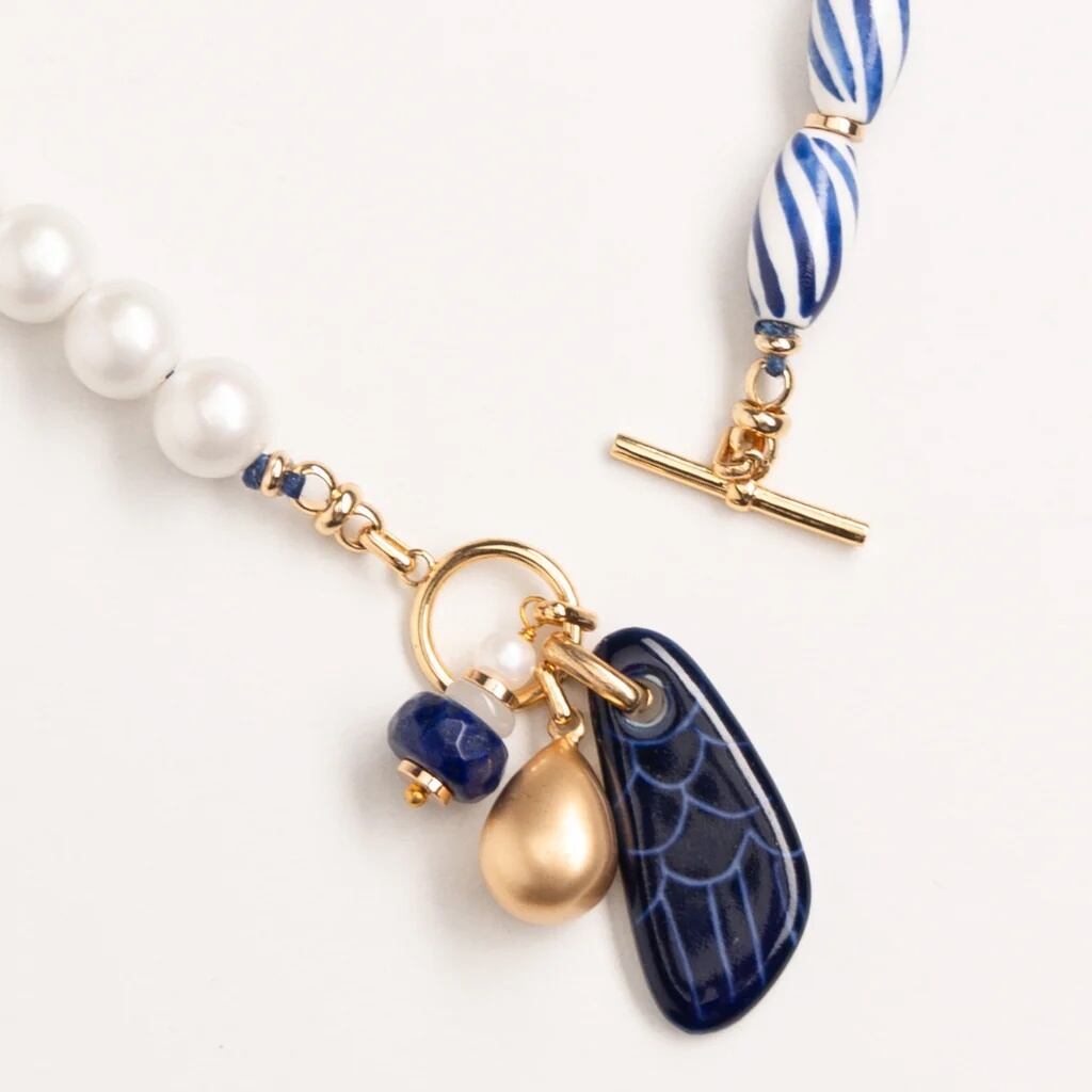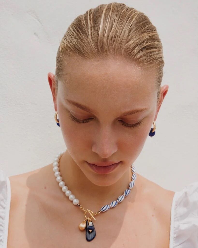 起源を明確に示すトーンを通して海の美しさとストーリーテリング提示するジュエリーのコレクション。真珠と青いビーズで飾られたネックレス、着用者が好きなように組み合わせることができます。